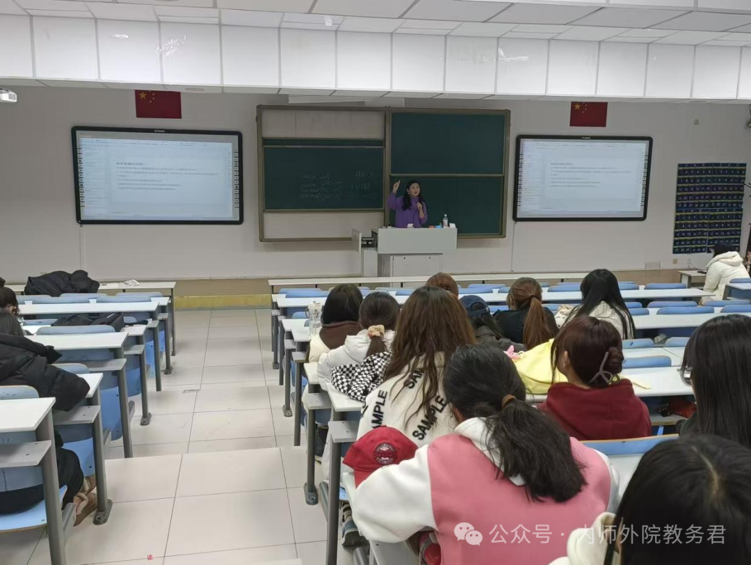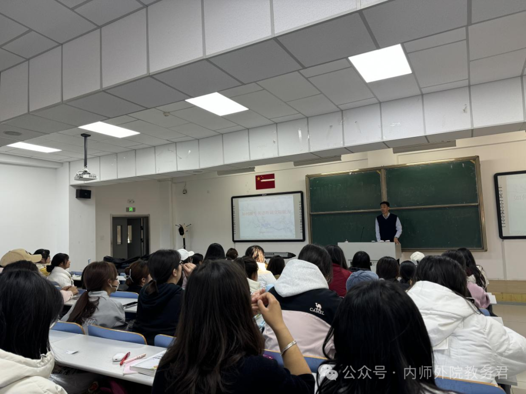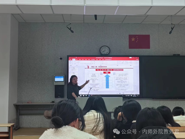 在首场讲座中,呼和塔拉老师以 “为师之道——英语师范生教学技能养成”为题,深入阐述了优秀英语教师应具备的专业素养。她重点强调了教师教育的核心要素,包括发音规范、板书技巧和教学设计等专业技能。通过邀请教师技能大赛获奖者分享经验,进一步展示了各类教学竞赛对提升教学能力的重要作用。呼和塔拉教授勉励同学们要心怀教育理想,持续提升自我。