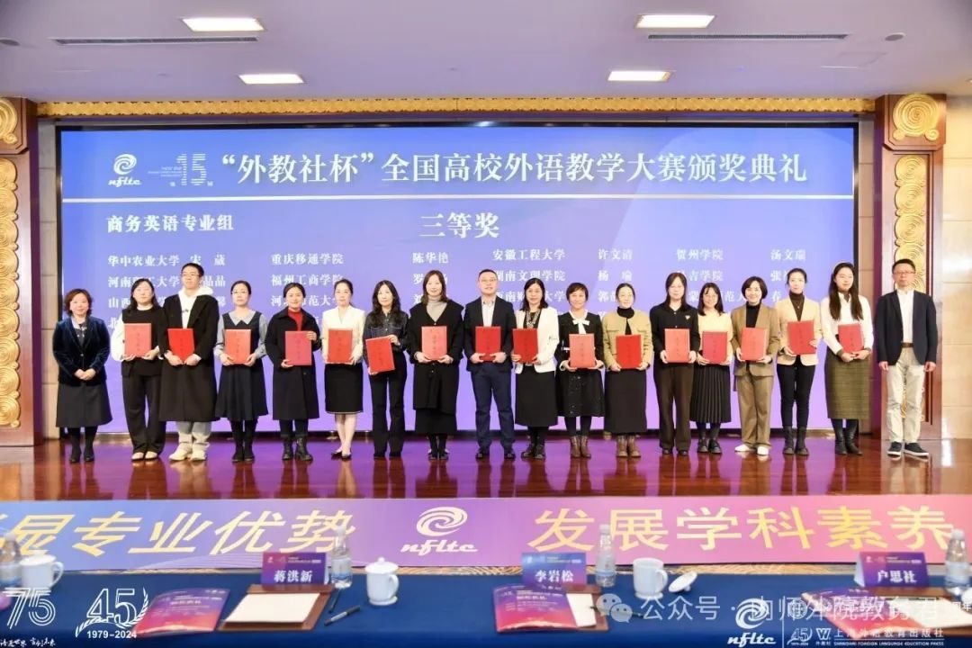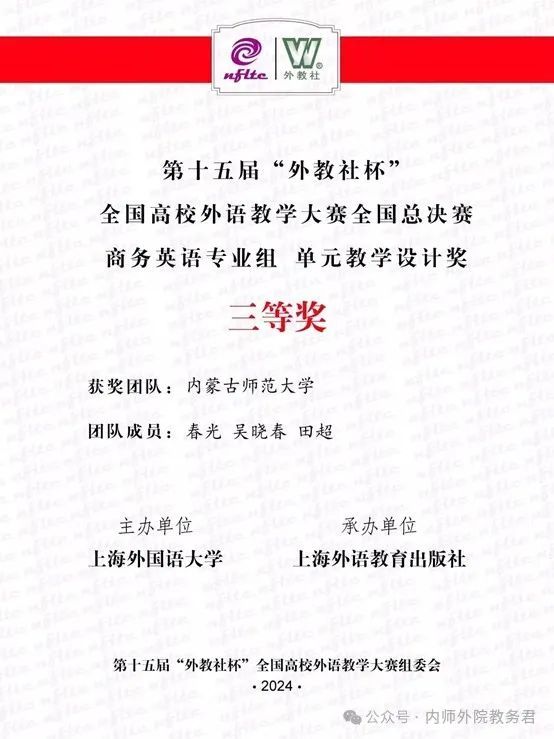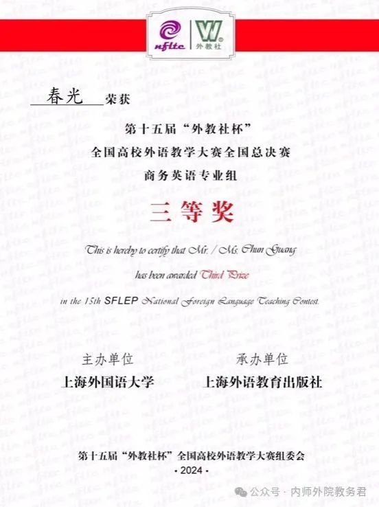 2024年12月6至8日,由上海外国语大学主办、上海外语教育出版社承办的第十五届“外教社杯”全国高校外语教学大赛全国总决赛在上海成功举办。我院英语系教师春光喜获商务英语专业组三等奖。此外,春光、吴晓春和田超三位教师组成的教师团队,其所提交的教学设计荣获三等奖。本届大赛分为英语专业组、商务英语专业组、翻译专业组和日语专业组四个组别,从全国30个省分赛区脱颖而出的79位特等奖获得者同台竞技。春光老师在比赛中展示出深厚的知识储备、精湛的教学水平和娴熟的方法技巧,最终获得此两项大奖。