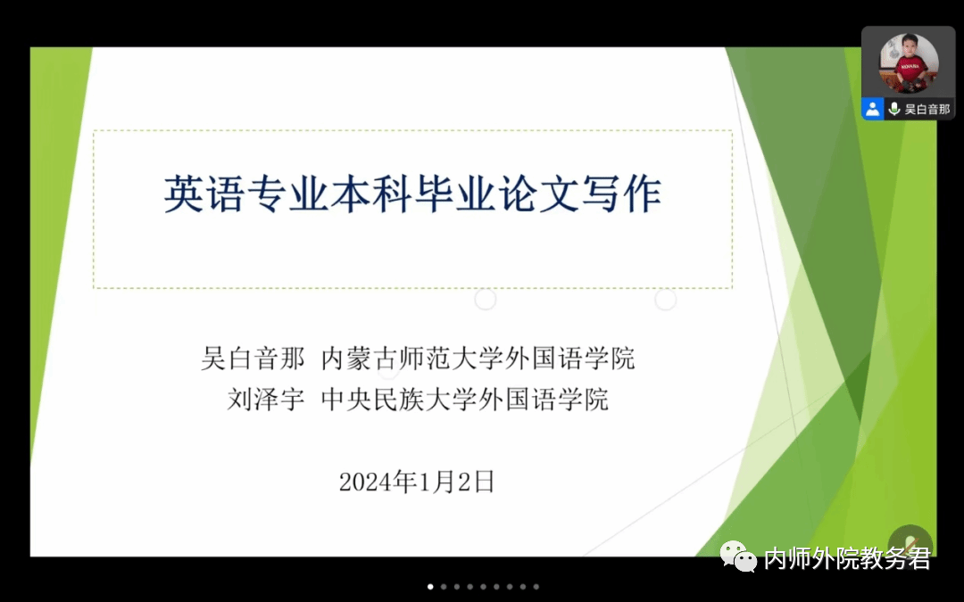 为更好地帮助2024届本科生提高毕业论文写作质量,提升本科生的学术素养,我院英语系于2024年1月2日晚线上召开“本科生毕业论文写作与学术论文发表指导”讲座。本次讲座由英语系系主任苏日娜老师主持,英语系吴白音那老师主讲,英语系2023届优秀毕业生刘泽宇同学分享论文写作经验,2020级、2021级英语专业本科生参加。