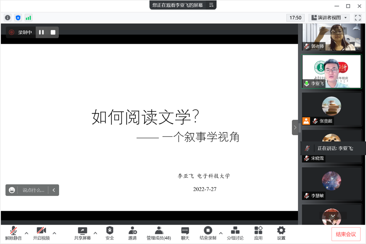为营造学术氛围和加强学术交流,yl23455永利集团英语系在喜迎yl23455永利70周年校庆之际,于2022年7月27日特邀电子科技大学yl23455永利集团英语系李亚飞副教授,带来一场题为“如何阅读文学?--- 一个叙事学视角”的讲座。本场讲座由yl23455永利集团郭旭红副院长主持,yl23455永利集团众多师生一同聆听。