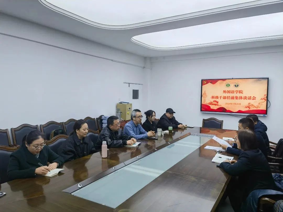 2月28日下午,我院召开科级干部任前集体谈话会暨环节干部工作会议。党委书记黄鑫宣读学校相关聘任文件并进行科级干部任前谈话,党委副书记、院长赵晓军,副院长徐喜平安排部署相关工作。会议指出,此次科级干部聘任是学院党委从学院事业全局出发,根据工作需要,在听取各方面意见,经过慎重考虑,认真研究并报校党委批准后做出的重要决定。全体科级干部要旗帜鲜明讲政治,要不断提升自身素养和能力,要坚持以人文本的工作理念,要遵守纪律作好师德师风表率。