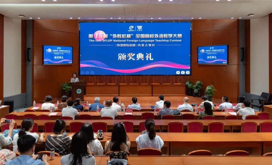 本次比赛的颁奖典礼于6月30日上午在赛罕校区信息楼报告厅举行。我校党委委员、副校长韩巍,西安外国语大学党委委员、副校长党争胜,上海外语教育出版社副社长严凯分别致辞。内蒙古自治区高等教育学会外语教育研究分会会长马占祥及区内兄弟院校相关负责同志、大赛评委专家、参赛选手等出席典礼。