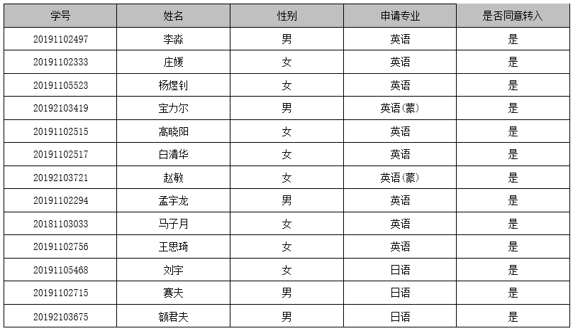 根据yl23455永利《关于开展2020年本专科生转专业工作的通知》(内师教发[2020]34号)、《yl23455永利集团本科学生转专业管理办法》有关规定,经yl23455永利集团转专业工作小组考核,拟接受如下同学提出的转专业申请,现予以公示。公示期为3个工作日,公示期内,如对名单有异议,可直接向yl23455永利集团反映。