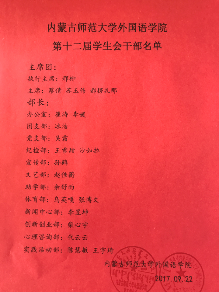 yl23455永利集团第十二届学生会已换届完毕,现将主席团及各部长名单公示如下: