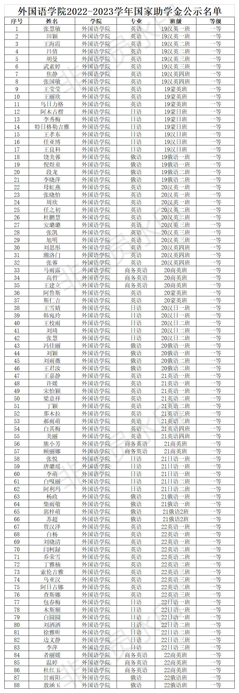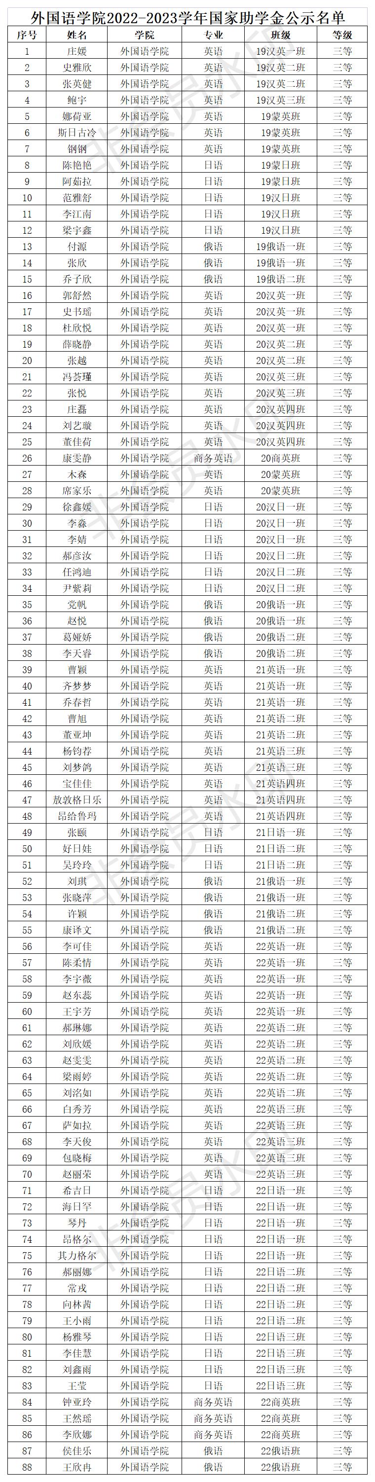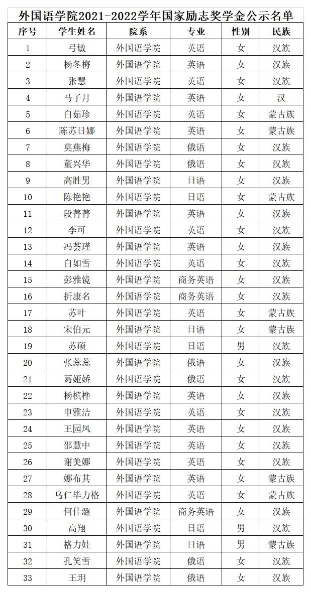 根据关于印发《yl23455永利国家励志奖学金、国家助学金评选管理暂行办法》的通知(校发〔2015〕73号),《关于印发<yl23455永利自治区励志奖学金评选暂行办法>的通知》(内师校发〔2021〕66 号),《关于开展 2021-2022 学年自治区励志奖学金评审工作的通知》(校学发〔2022〕19 号),以及《关于开展 2021-2022 学年国家励志奖学金、2022-2023 学年国家助学金评审工作的通知》(校学发〔2022〕17 号)等文件精神,我院组织开展了评选工作。经学生本人申请、班级评审小组审核、班主任审核、学院评审委员会评选,最终确定拟推荐人选名单(国家励志奖学金33人,自治区励志奖学金58人,国家助学金一等88人、二等137人、三等88人)。为体现公开、公平、公正的原则,现将拟推荐名单予以公示3天。如有异议,请来电或来信反映。