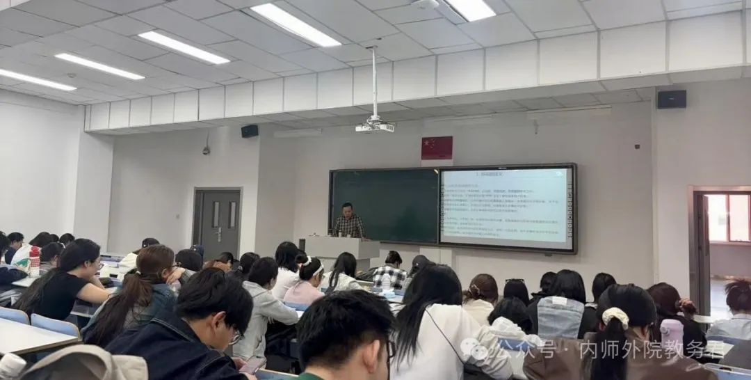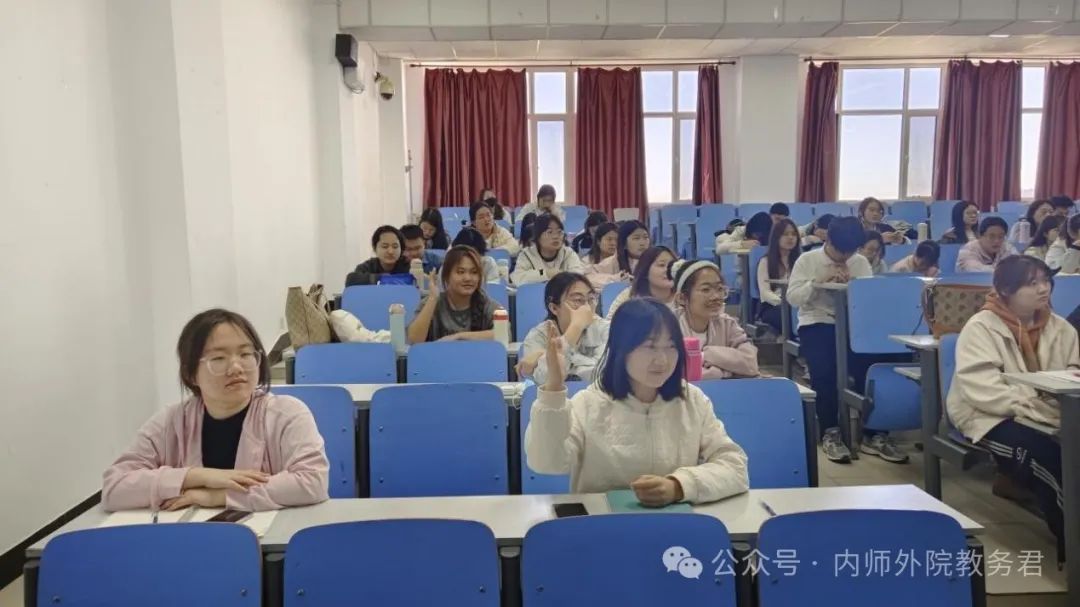 在基础性研究方面,呼和塔拉老师建议实习报告应侧重于扩展和完善外语教育的基本理论。在应用研究的调查中,她以“小组积分制在初中英语教学中的应用效果”为例,详细讲解了调查内容,并分享了调研经验。对于英语调查研究报告的撰写,呼和塔拉老师强调要从局内人变为局外人,通过客观真实的调查进行实验,以满足科学性原则。此外,呼和塔拉老师还分享了调查报告与教育研究报告的模板,并提供了撰写建议,通过具体实例为大家指明方向。最后,呼和塔拉老师建议与会实习生合理规划时间,在实习前两周内确定选题,并尽量在实习期间完成调查。讲座中,同学们与老师积极互动,认真做笔记,氛围活跃。