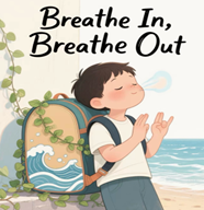男孩背靠背包的姿势是核心意象:背包的支撑感转化內“心理依靠”的具象化,如同在情绪风暴中有了稳定的锚点;双手比出的“呼吸手势”(掌心开合)既是动作引导,也通过明快的黄色衣袖形成视觉焦点,吸引用户将注意力从杂念收回到身体感受。整体场景刻意简化背景,用淡蓝色渐变模拟天空或水面,营造“留白”的心理空间,避免信息过载加剧焦虑。